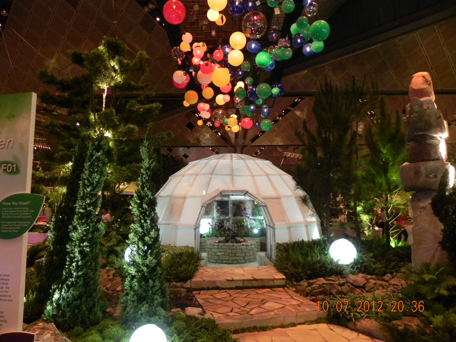 In a different display, the vendor uses lots of Flame Lily (scientific name: Gloriosa superba) to do up the stall. Then there was an interesting setup with 3 trees, as if they were rubber seeds germinating from a seed. There was also a north pole, complete an igloo and arctic aurora in the form of balloons.